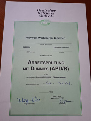 Ruby und Skotti vom Wachtb. Ländchen haben die Dummy/A bestanden. Ruby mit 74 Pkt. und Skotti mit 75 Pkt., was für eine tolle Leistung für die jungen Hunde. Herzlichen Glückwunsch, fleißig seid Ihr.