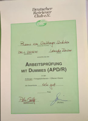 Phannie vom Wachtb. Ländchen hat ihre Dummy A mit sehr gut bestanden. Toll gemacht ihr Zwei, ein schönes Team.